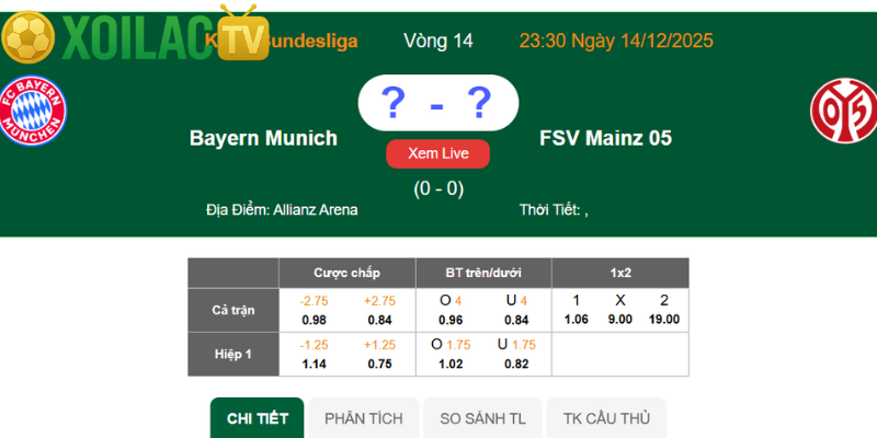Ở kèo châu Âu, mọi chỉ số đều nghiêng tuyệt đối về phía đội chủ nhà. Phong độ thăng hoa, lợi thế sân bãi cùng đẳng cấp vượt trội giúp Bayern nắm chắc 99% phần thắng. Mainz 05 đang khủng hoảng toàn diện, vừa thua Univ. Craiova tại cúp châu Âu, vừa bết bát tại giải quốc nội, hoàn toàn không có cơ sở để tạo nên địa chấn. Chọn Bayern Munich thắng là phương án an toàn tuyệt đối cho người chơi.